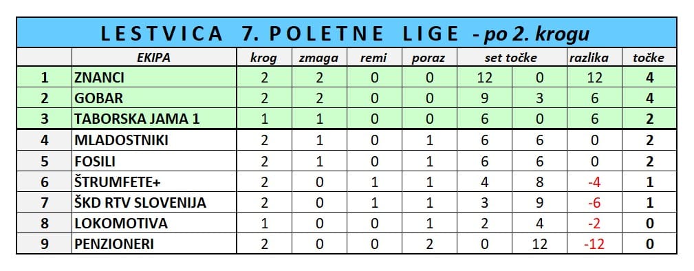 Zapisniki – krog: 1.-prosti; 2.-Gobar Iskra 1; 3.-Hidro 2; 4.-Poštar; 5.-Delo; 6.-RTV SLO; 7.-Gobar Iskra 2; 8.-Hidro 3; 9.-Ograjca; 10.-prosti; 11.-Gobar Iskra 1; 12.-Hidro 2; 13.-Poštar; 14.-Delo; 15.-RTV SLO; 16.-Gobar-Iskra 2; 17.-Hidro 3; 18.-Ograjca.