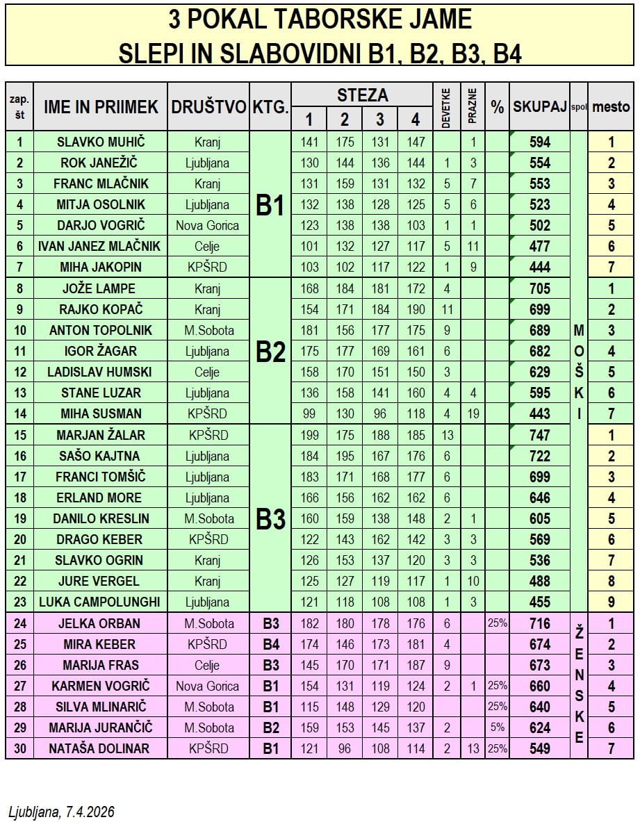 Raspis 3. Pokala Taborske jame; Prosti termini – sprememba 25.4.2026;